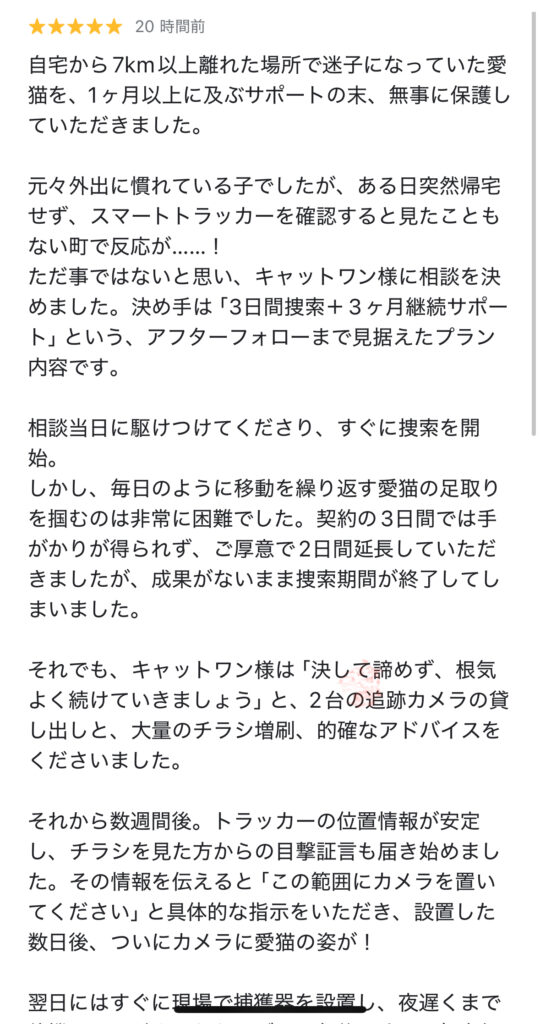 キャットワンは長引く捜索も粘り強く対応、保護率が高い理由の一つです。