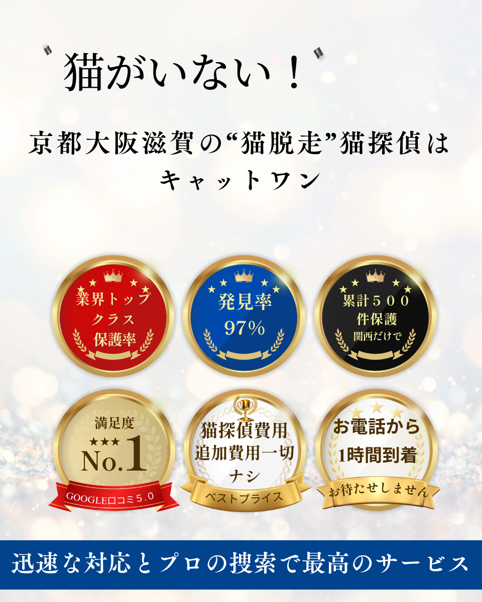 A. キャットワンは業界トップクラスの保護率を誇ります。これは、MBA取得者が迷子猫の捜査の研究が盛んな海外の論文を原文で読み解き、猫の習性を深く理解したプロの捜索員と、動物介護士、小動物看護士など専門資格を持つ現場で培った経験を捜索に応用した結果です。万が一捜索期間中に保護できなけえれば安心パートナーシップ3ヶ月保証が無料で付いています。