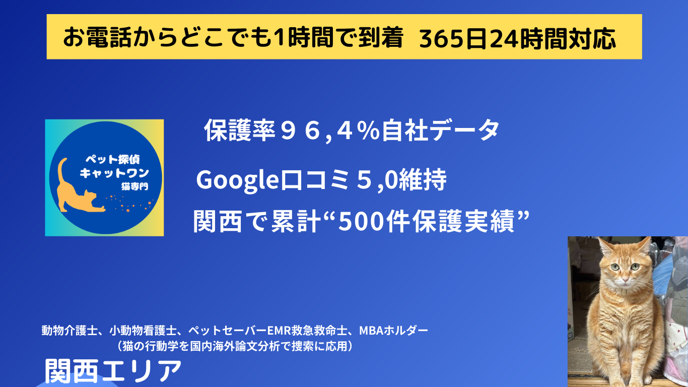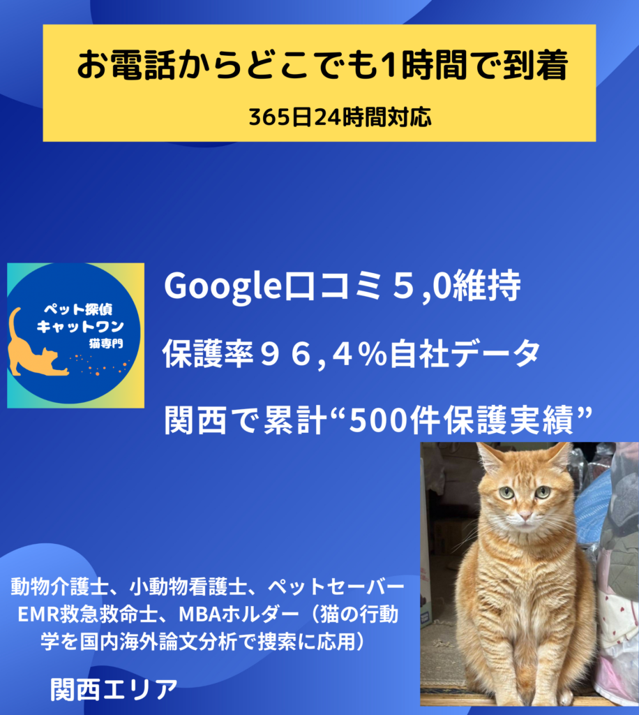 小動物看護師、ペットセーバー救急救命士の資格を持つ猫探偵が、猫の行動や生態に着目し、安全に発見し保護します。関西で12年間の保護猫活動の実績、保護猫団体を運営しています。