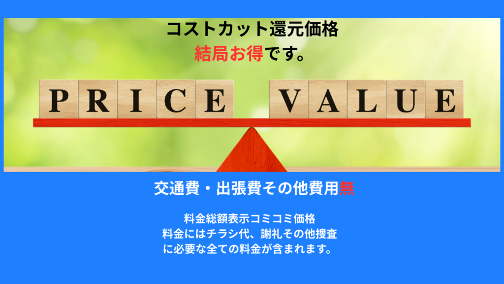 一般的な料金の「2日間」料金と同じ金額で「3日間」捜索➕万が一保護できなければ3ヶ月保証 ※パック料金が結局お得です!:最終支払いで比較してください。
