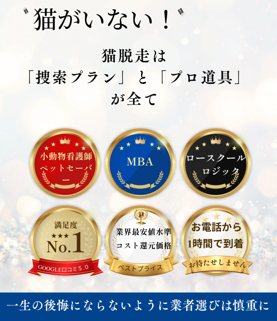 私たちは、単に猫を捜すだけでなく、高い倫理観に基づき、お客様に寄り添い続ける**「3ヶ月サポート」こそが、他社には真似できない私たちのオンリーワン**であると定義しています。このエールを胸に、お客様の大切なご家族との再会に向けて全力を尽くします。