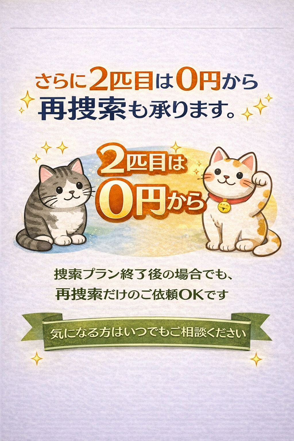 - 多くの業者では、猫ちゃんの発見・保護に至った場合に「成果報酬」として別途費用が発生することがあります。しかし、私たちは契約時の料金以外、一切の追加費用をいただきません。