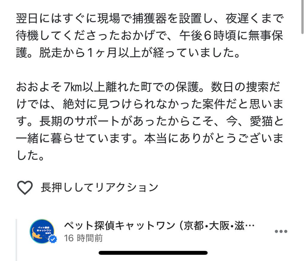 金額の多寡を超えて、大切な家族との再会を叶えてくれたその専門性と価値は、計り知れないものがあります。キャットワンさんの徹底したプロフェッショナルなサポートには、心から感謝しています。