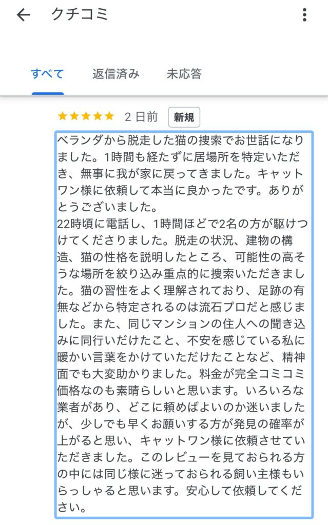 多くの脱走猫探偵サービスを検討しましたが、最終的にキャットワンさんに依頼して本当に良かったと思っています。