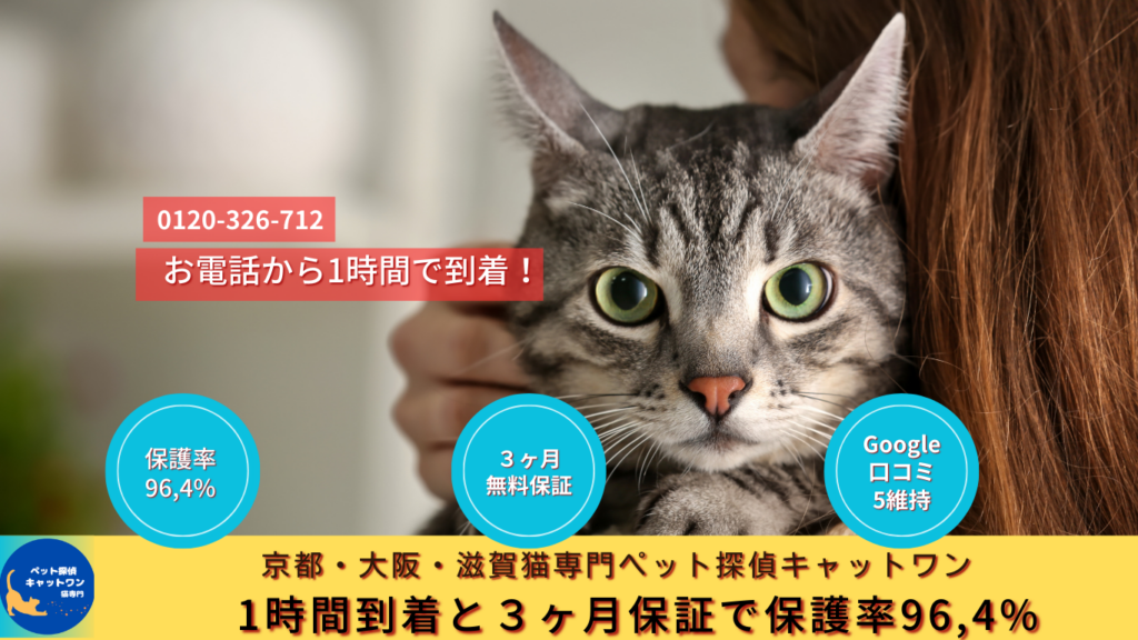 A. キャットワンは業界トップクラスの保護率を誇ります。これは、MBA取得者が迷子猫の捜査の研究が盛んな海外の論文を原文で読み解き、猫の習性を深く理解したプロの捜索員と、動物介護士、小動物看護士など専門資格を持つ現場で培った経験を捜索に応用した結果です。万が一捜索期間中に保護できなけえれば安心パートナーシップ3ヶ月保証が無料で付いています。