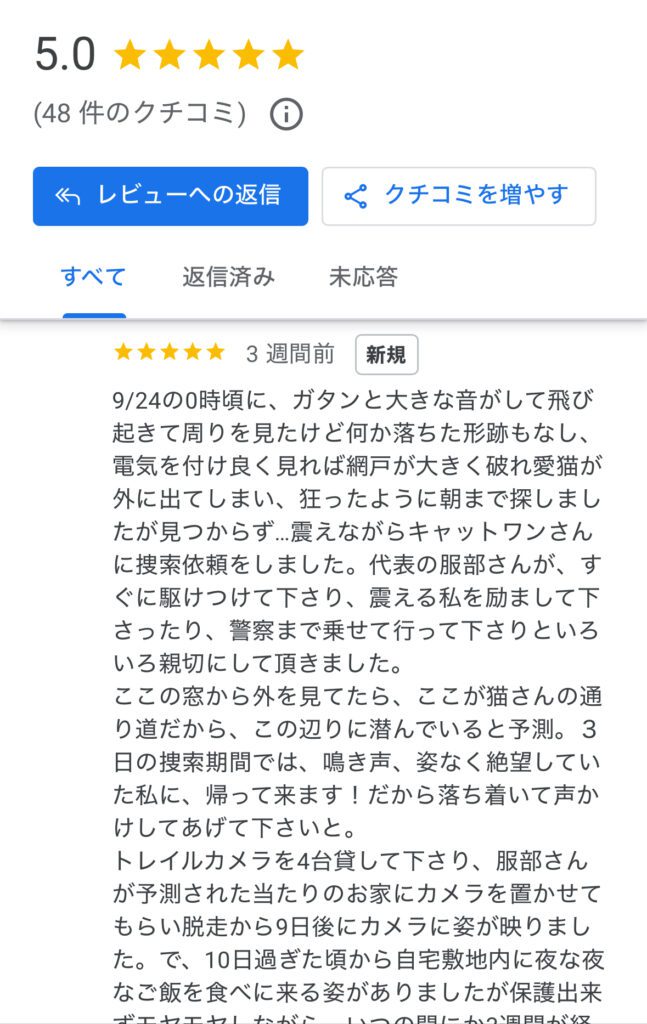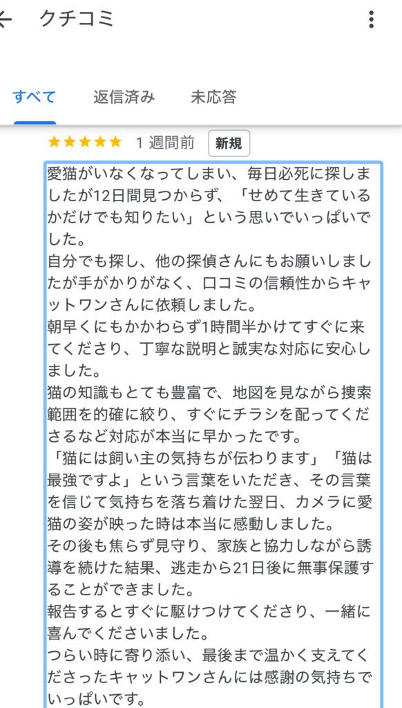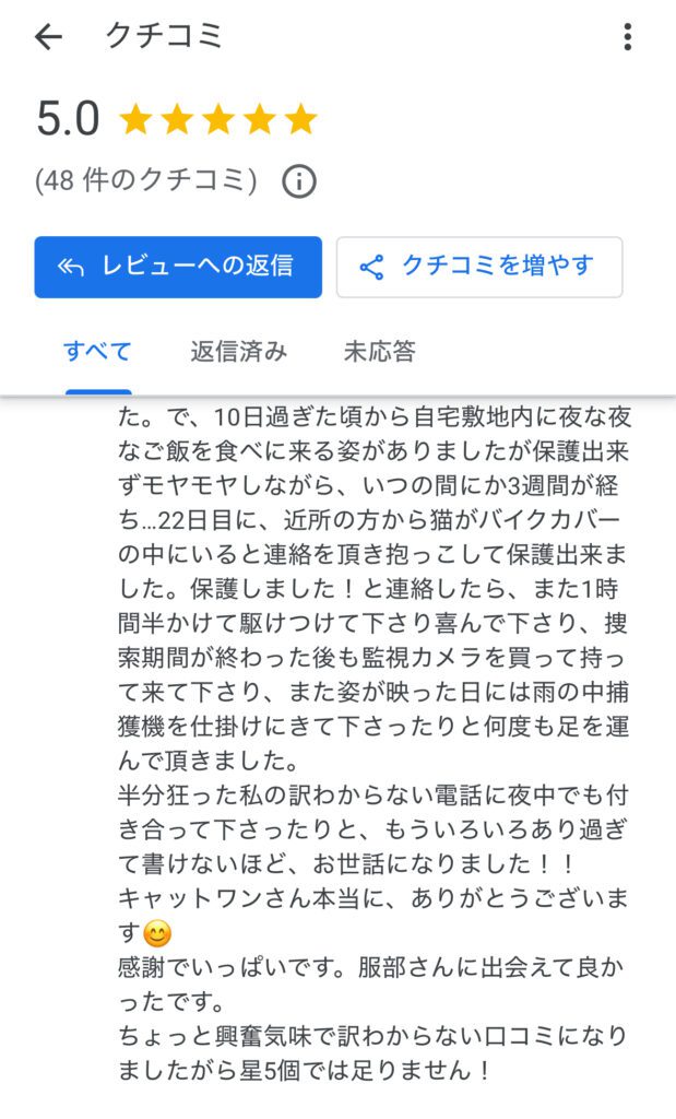 - 「諦めかけていた所、遠路21日後に無事保護することができました。励ましていただき本当に感謝しております」