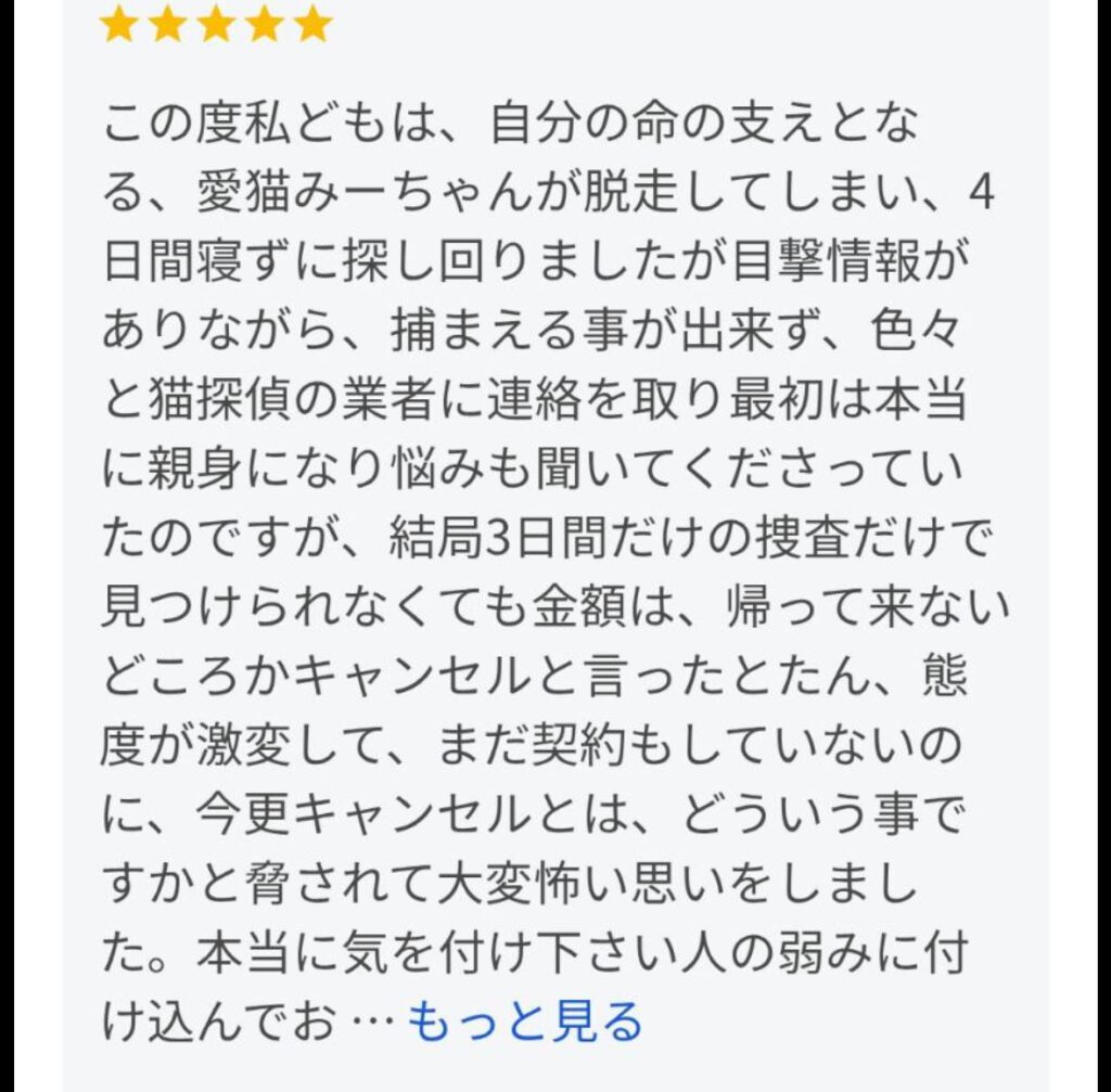 - 不誠実な捜索: 3日間だけの形ばかりの捜索で打ち切られ、高額な費用を支払ったにもかかわらず、愛猫を見つけることができなかったという事例も報告されています。