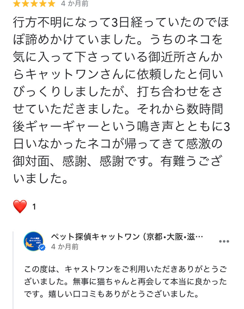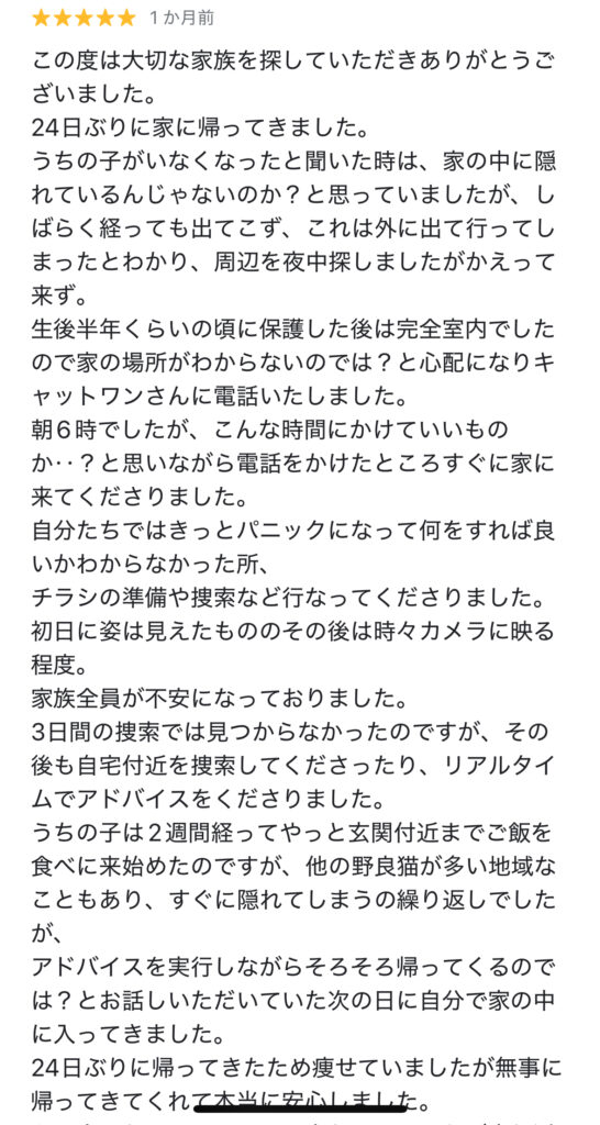「脱走から3日・4日経過後の猫さんも通常捜索で無事に保護」お客様の生の声