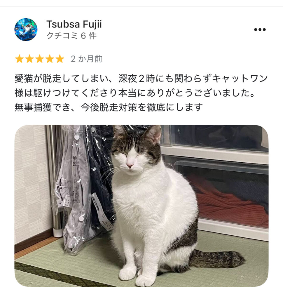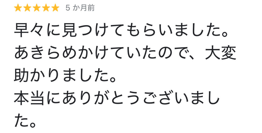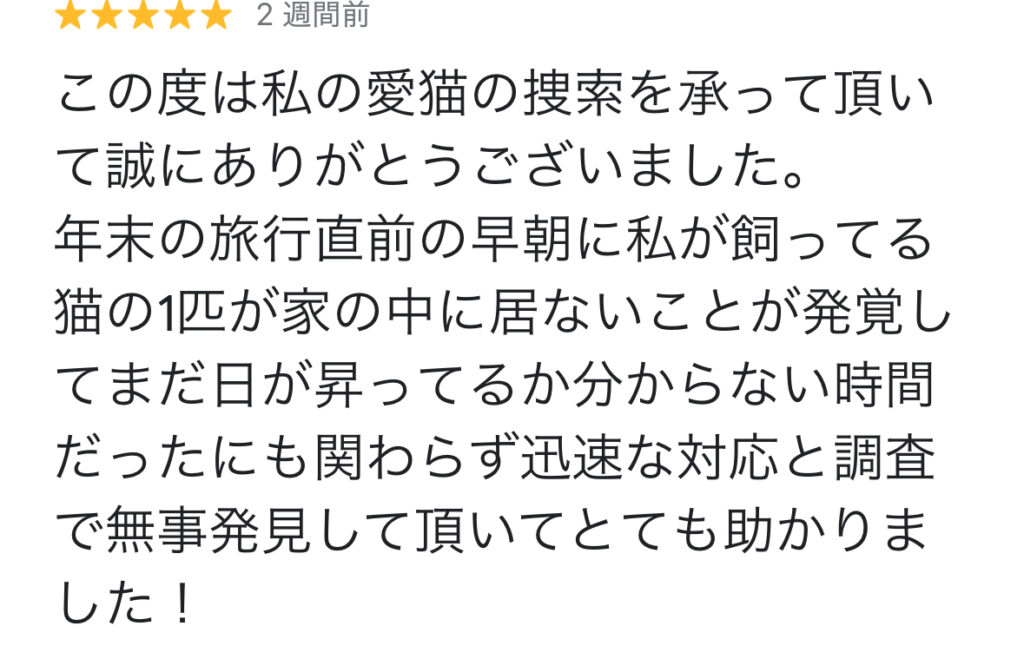 滋賀県のお客様からの口コミ 「京都からと聞いて少し不安でしたが、驚くほど早く駆けつけてくれました。親身になって話を聞いてくださり、深夜まで一緒に探してくれたおかげで、無事に愛猫を抱きしめることができました。」