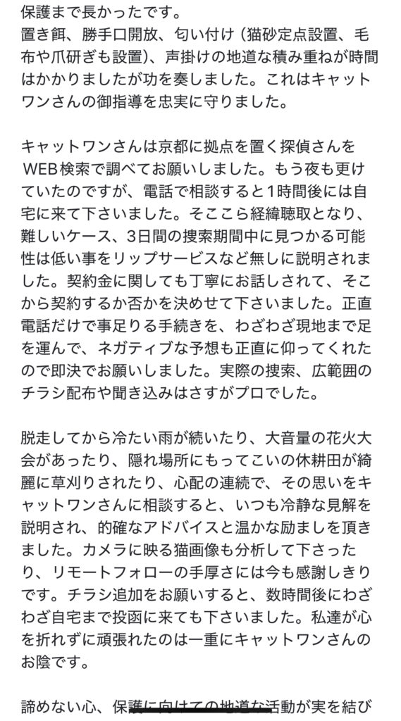 キャットワンでは、4日目以降の延長料金は0円(無料)です。 捜索が難航した場合でも、飼い主様が費用を気にせず、最後まで諦めずに捜索を続けられる環境を提供しています。