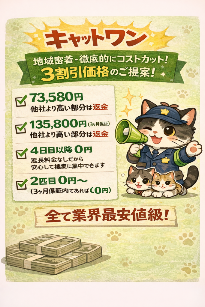 多くの業者が基本料金のみを提示しますが、大切なのは「総額」です。 一般的な猫探偵の料金体系では、基本料金に加えて交通費、深夜料金、1週間以上経過している場合の追加料金などが加算され、気がつけば10万円〜18万円に達するケースも少なくありません。 キャットワンでは、捜索に集中できるプラン設計を行っており、他社より高い項目がある場合はその差額を返金する体制を整えています。