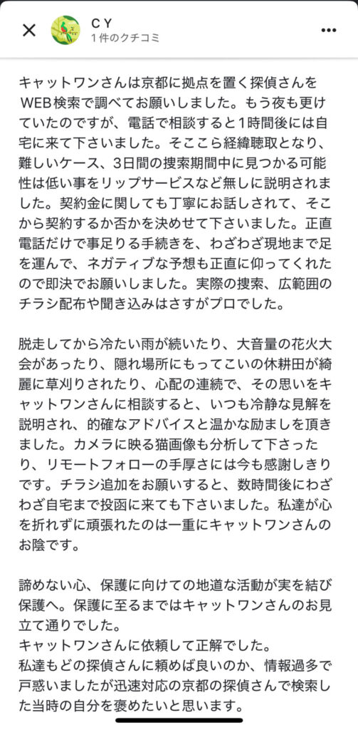 これまで「ペット探偵キャットワン」では、捜索意欲が旺盛で「自分の手であの子を保護したい」と強く願う飼い主様に対し、その都度、個別に特別なプランを立ててご支援してまいりました。