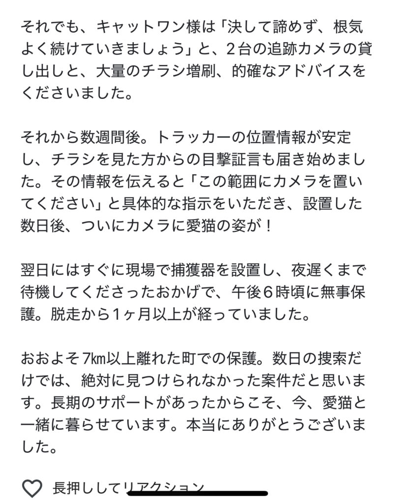- 発見時の保護:発見後は完全無料で保護に伺います。注意)長期サポートの実績があるのはキャットワンだけの独自性。